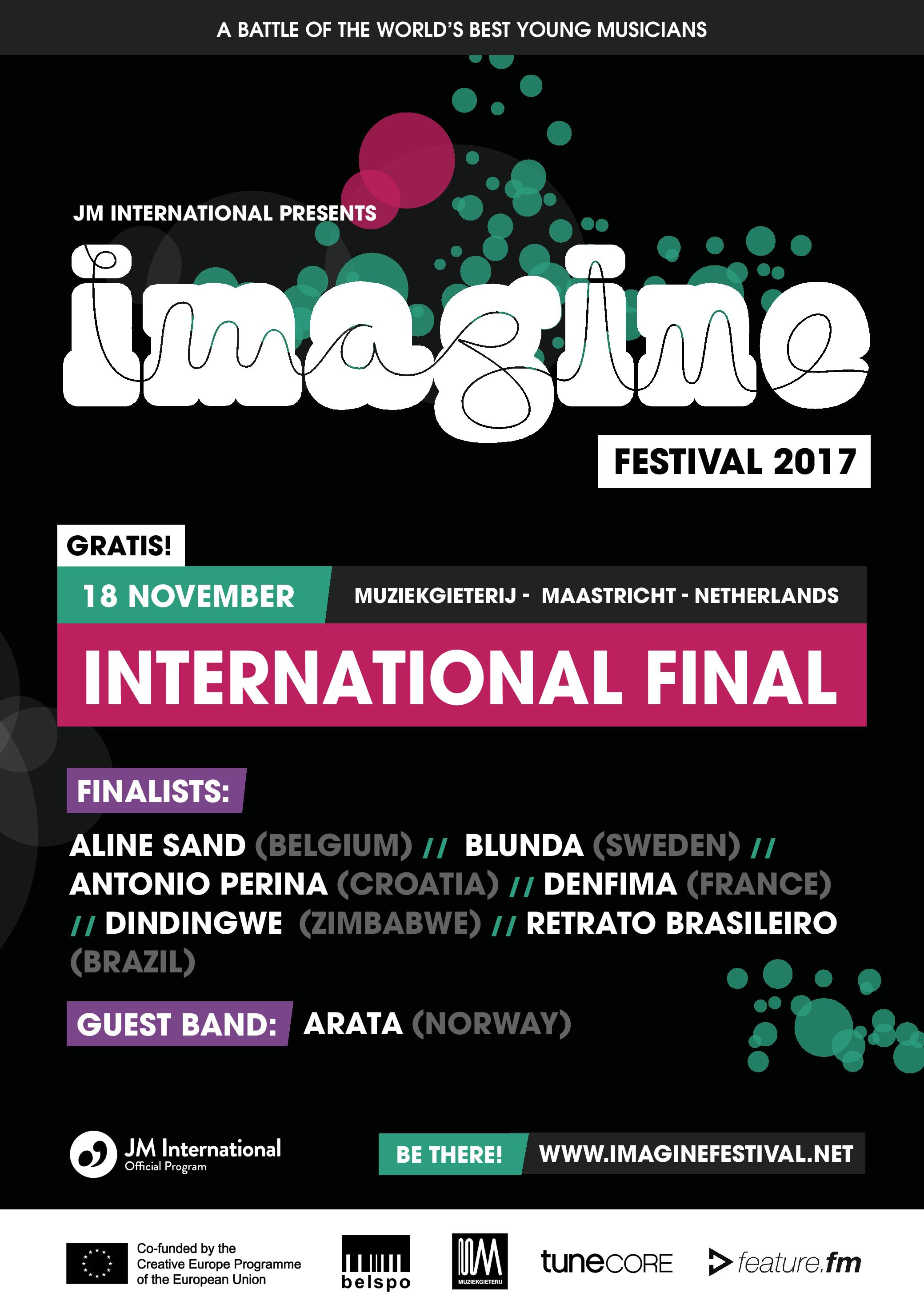 This year's big event is set for the 18th of November 2017, bringing together the best young musicians from Belgium, Brazil, Croatia, France, Sweden and Zimbabwe to compete for the international title. The Imagine International Final will take place in Muziekgieterij, Maastricht, Netherlands.